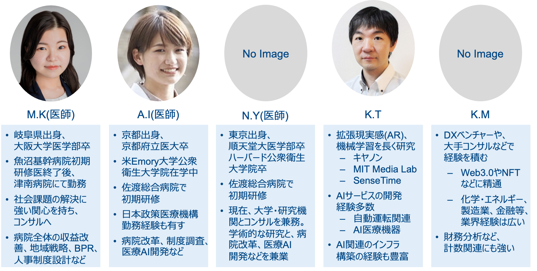 - 医師 (初期研修修了者複数名。阪大卒、京都医科大、ハーバード公衆衛生大学院卒 など)